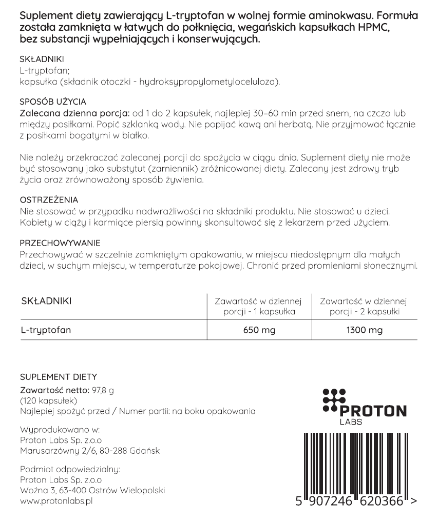 L-tryptofan; kapsułka (składnik otoczki - hydroksypropylometyloceluloza).