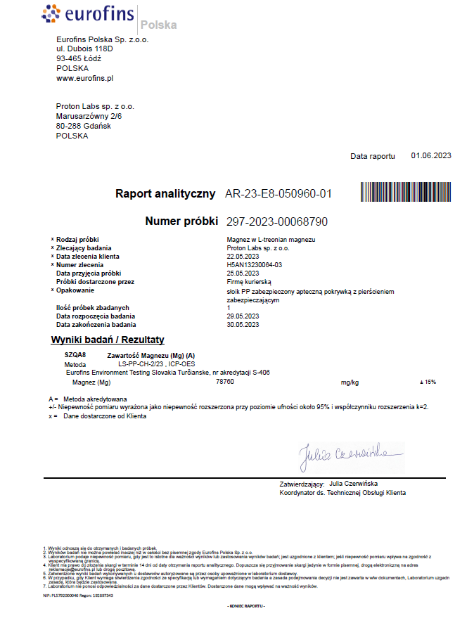 Wyniki zleconych badań niezależnym laboratoriom Eurofins potwierdzają deklarowaną zawartość magnezu!