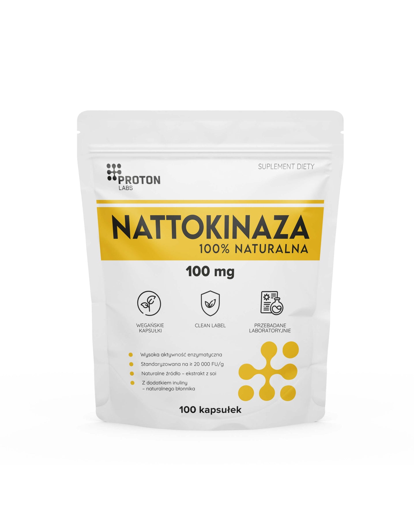 Standaryzowany ekstrakt z fermentowanych nasion soi (Bacillus subtilis natto) o wysokiej koncentracji enzymu (2000 FU w 1 kapsułce). Każda kapsułka dostarcza precyzyjnie odmierzona porcję nattokinazy, cenionej w suplementacji osób dbających układ krążenia i prawidłowy poziom chlesterolu.